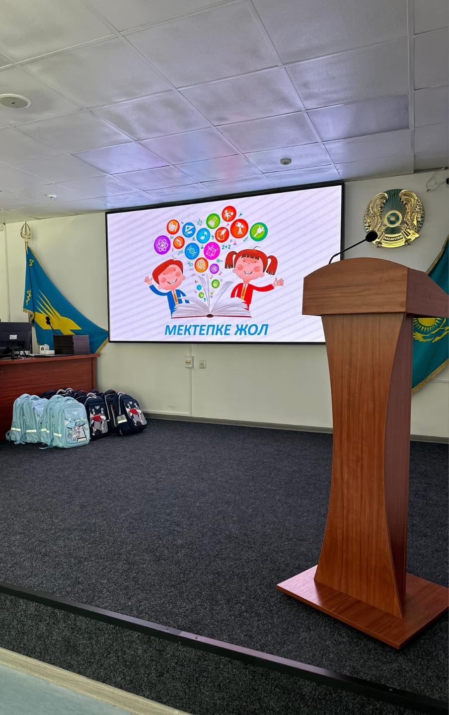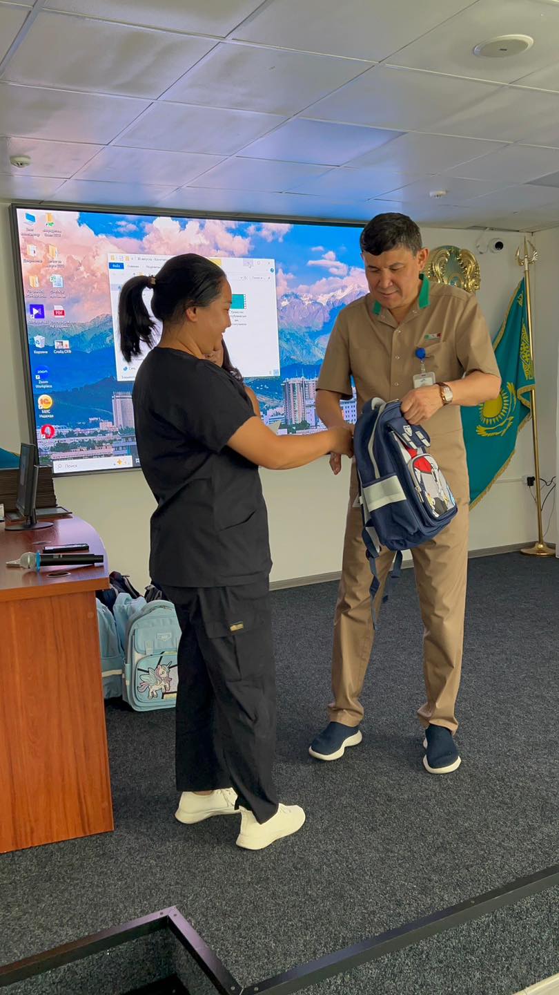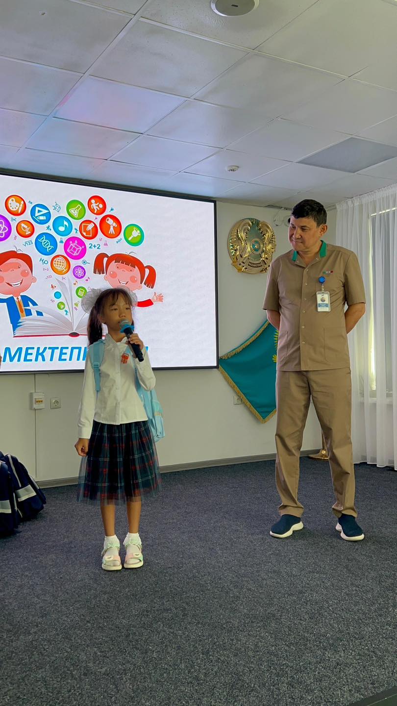 Салтанатты рәсімде аурухана директоры Алмаз Джувашев пен кәсіподақ төрағасы Алтынай Усманова бүлдіршіндерге мектеп сөмкесін табыстап, жаңа оқу жылында табыс тіледі.